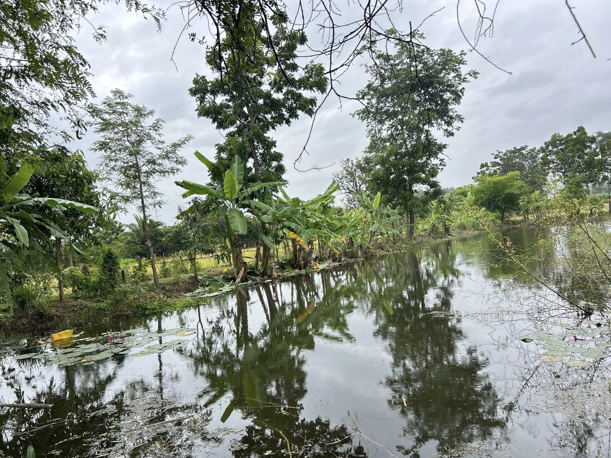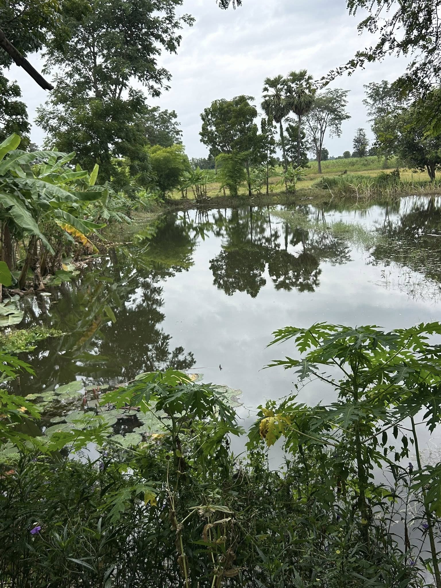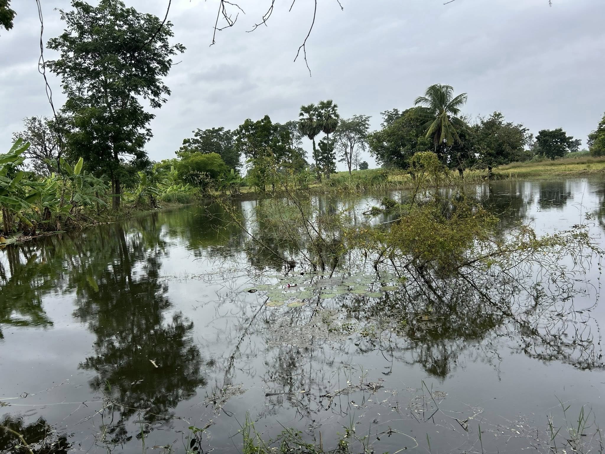 ตรงกลางมีสระน้ำขนาด 1 ไ ร่ มีน้ำตลอดปีใสสะอาด ปล่อยปลาไว้เยอะเลย