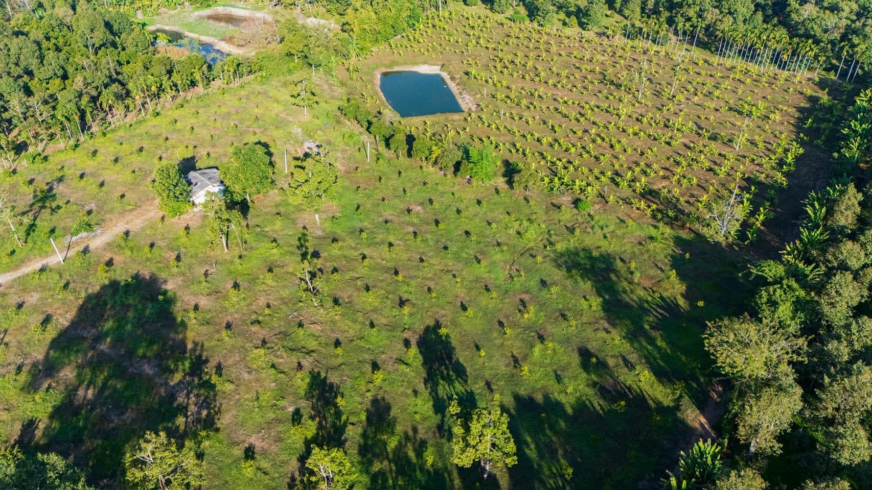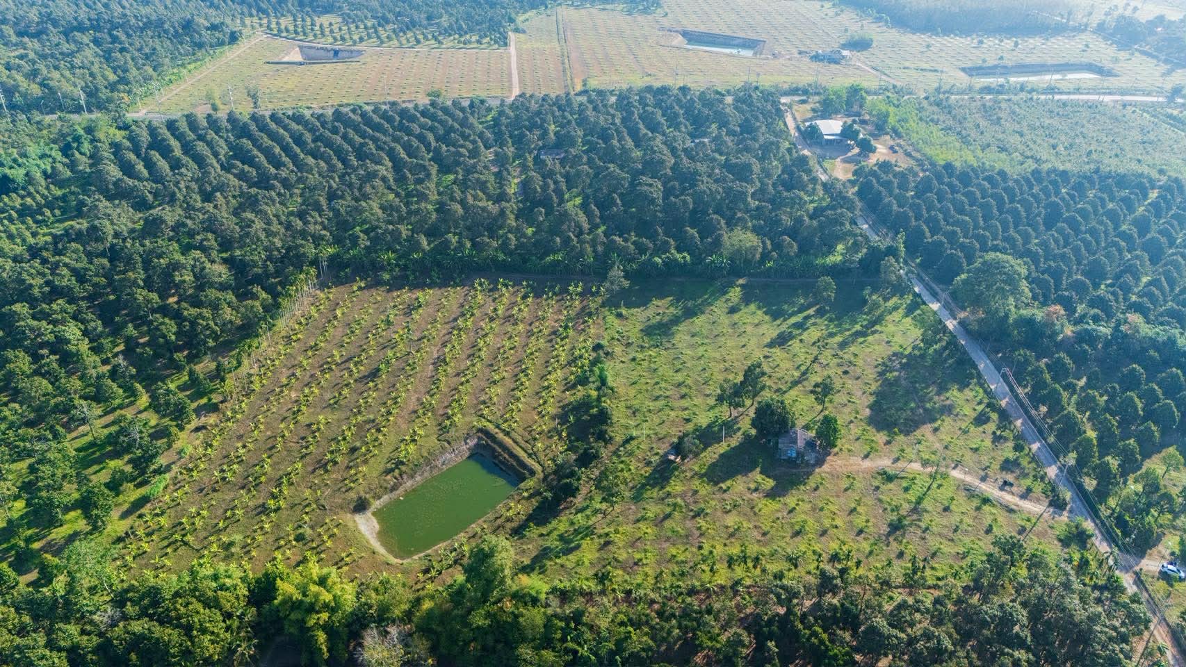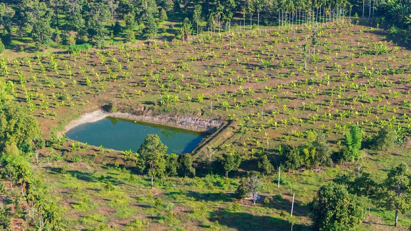 วางท่อรดน้ำด้วยระบบสปริงเกอร์ มีบ่อน้ำขนาดใหญ่สำหรับเก็บน้ำ